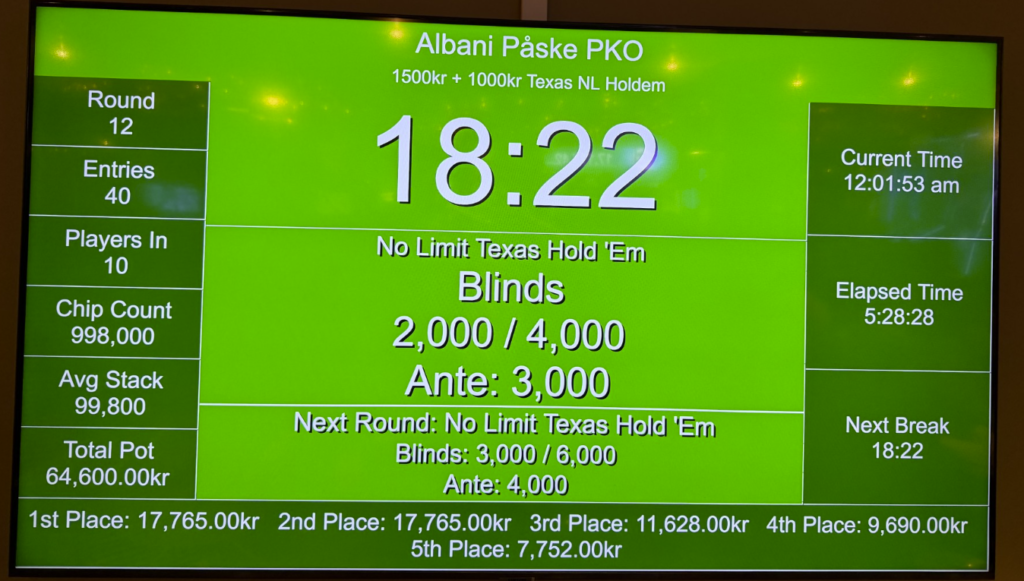 Vi har ikke fået alle knockout-præmierne, men ved at David vandt cirka 8.000 kr. i KO’s mens Hinze vandt cirka 9.000 kr. i KO’s, som de to der havde vundet flest.