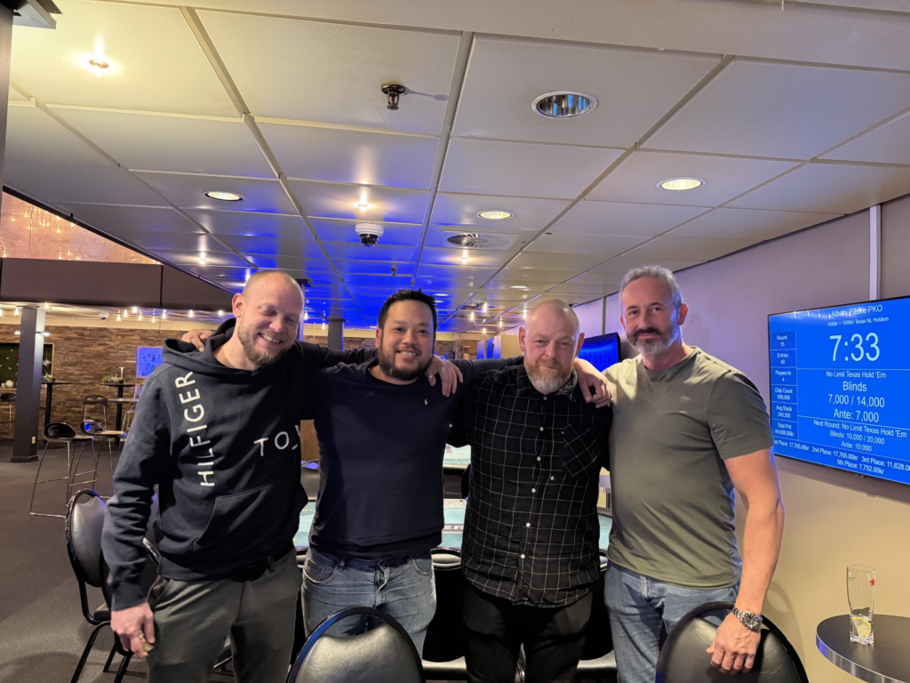 Til sidst sidder de fire spillere tilbage. Her er chips forholdsvis ens – klokken er 01.45 og beslutningen forholdsvis simpel. Vi laver en ICM-deal og beholder egne KO-præmier.
