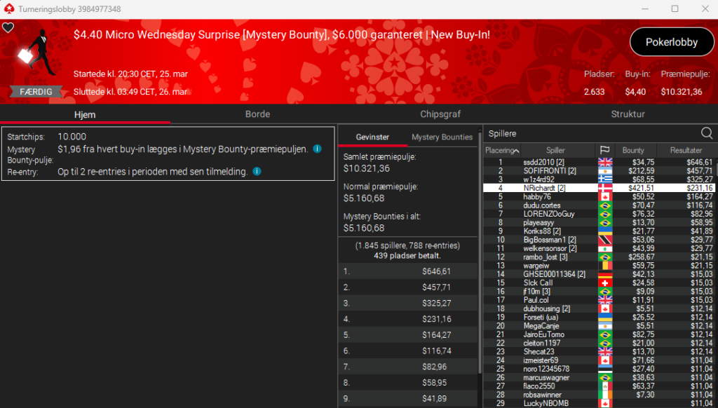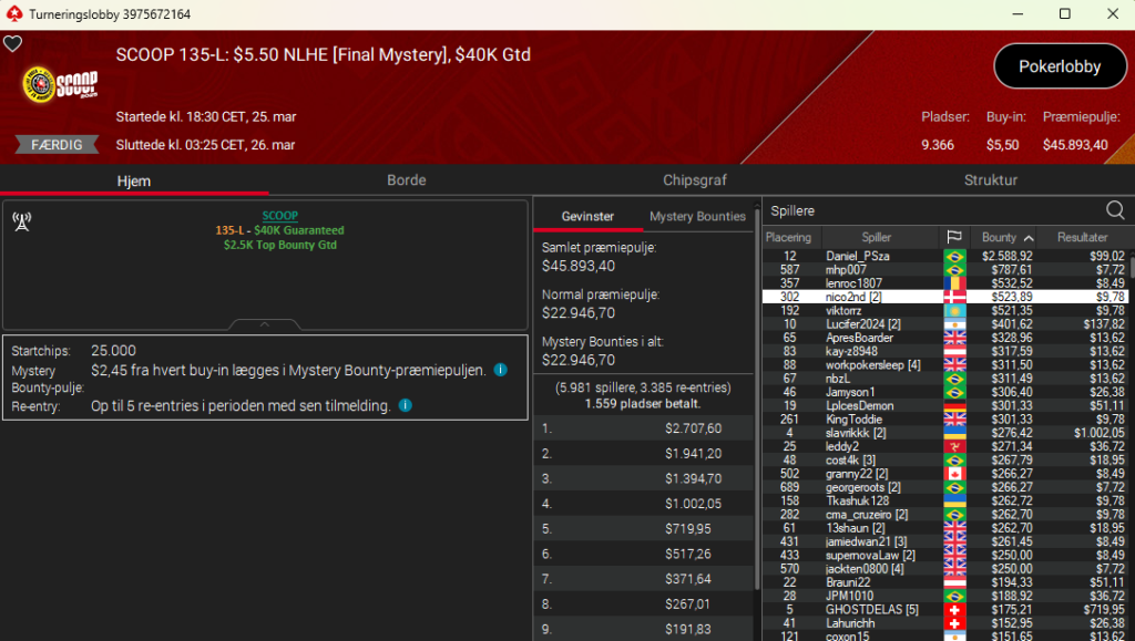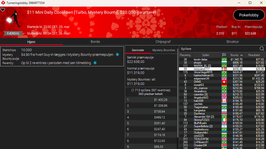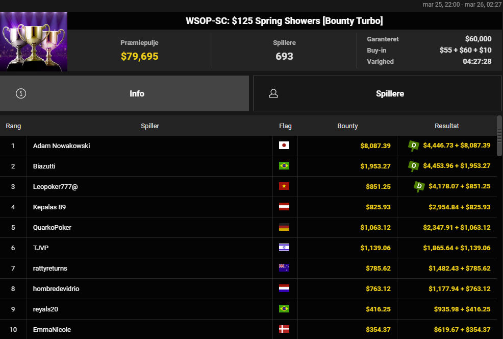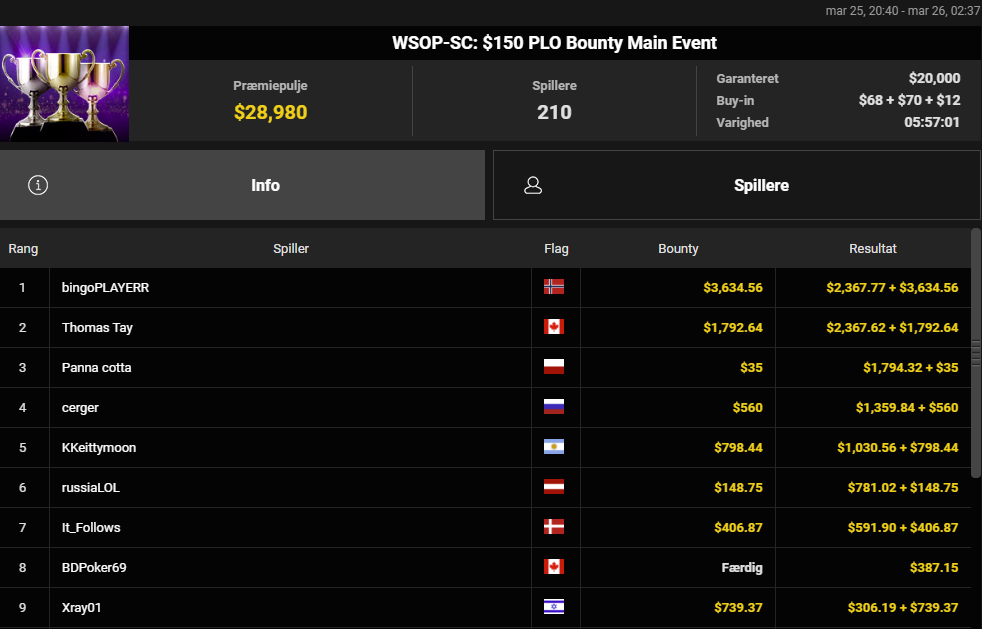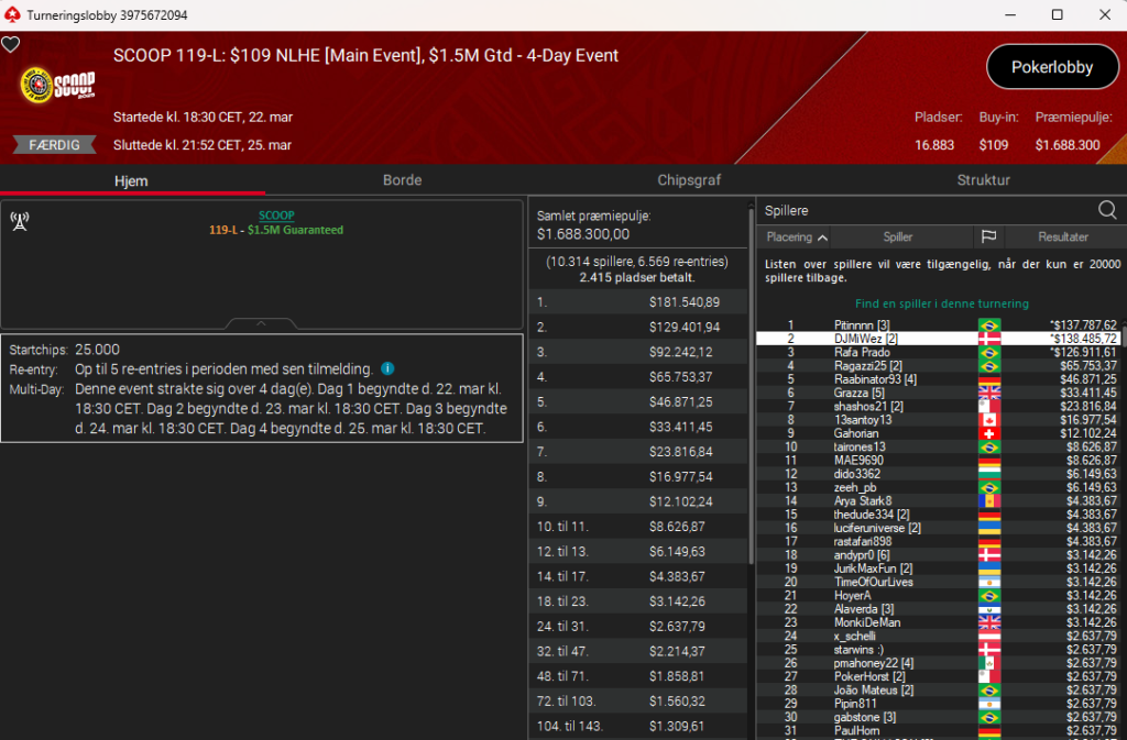 Det hele endte med en superflot 2. plads til DJMiWez i SCOOP 119: $109 NLH Main Event med $1,5 millioner garanteret. Præmien endte på imponerende $138.486 efter en 3-vejs deal med to fra Brasilien. De spillede videre om trofæet og titlen, men trods et chiplead, så lykkedes det ikke for danskeren at tage titlen med hjem til Danmark. Det er nu stadigvæk en fantastisk præstation og resultat. Stort tillykke herfra.