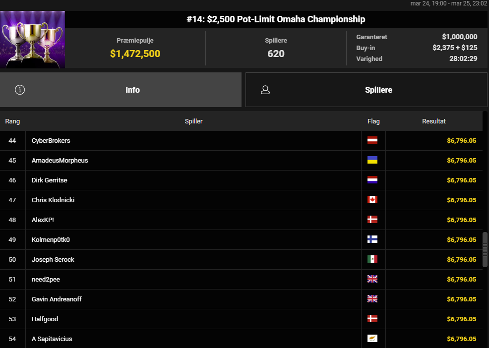 Andre danske resultater på Danske Spil Poker onsdag