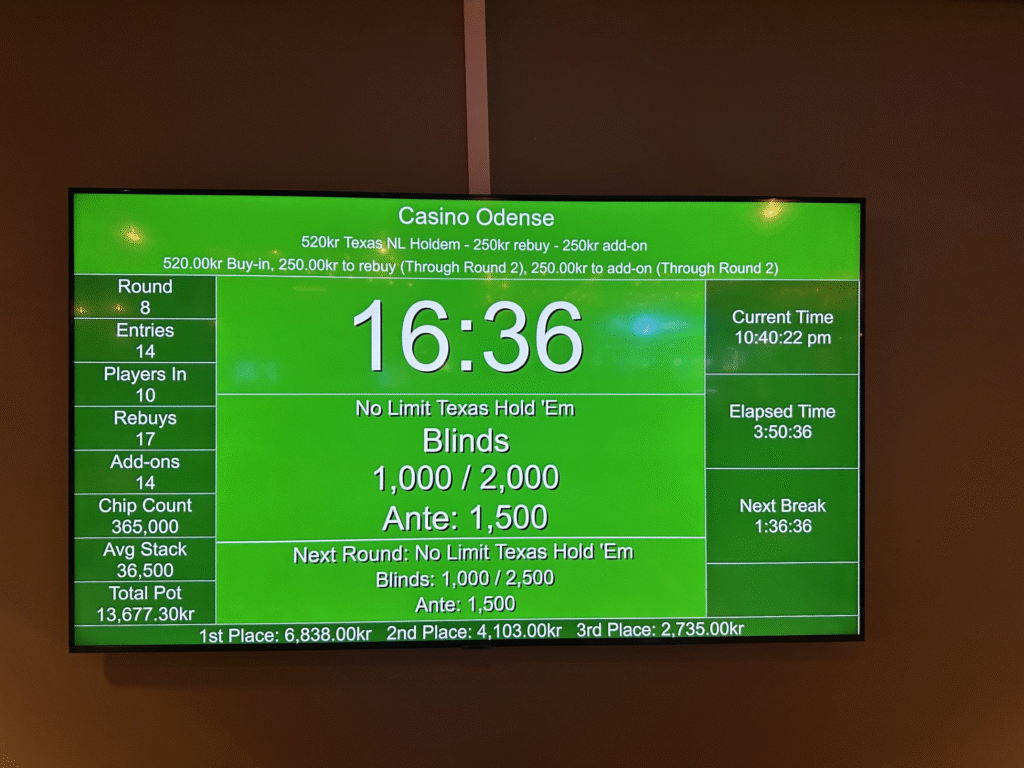 Turneringen startede kl. 18.45, som altid på Casino Odense, men sluttede noget atypisk først kl. 02.00.