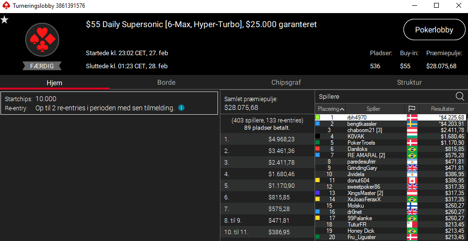 Først lykkedes det os at fange Fehim Hajdari, der hedder rbh4970 på PokerStars. Han nappede et spil sent på aftenen i hyperturneringen; $55 Daily Supersonic (6-max Hyperturbo) med $25.000 garanteret og tog den ned trods han på et tidspunkt var dybt dybt i hullet.