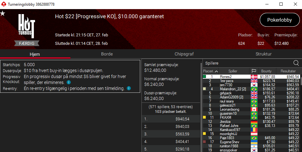 Det blev til to andre danske sejre torsdag aften på PokerStars. Først blev Rones2 dansk vinder i Hot $22 PKO med $10.000 garanteret. Den sejr gav $1.999 totalt.