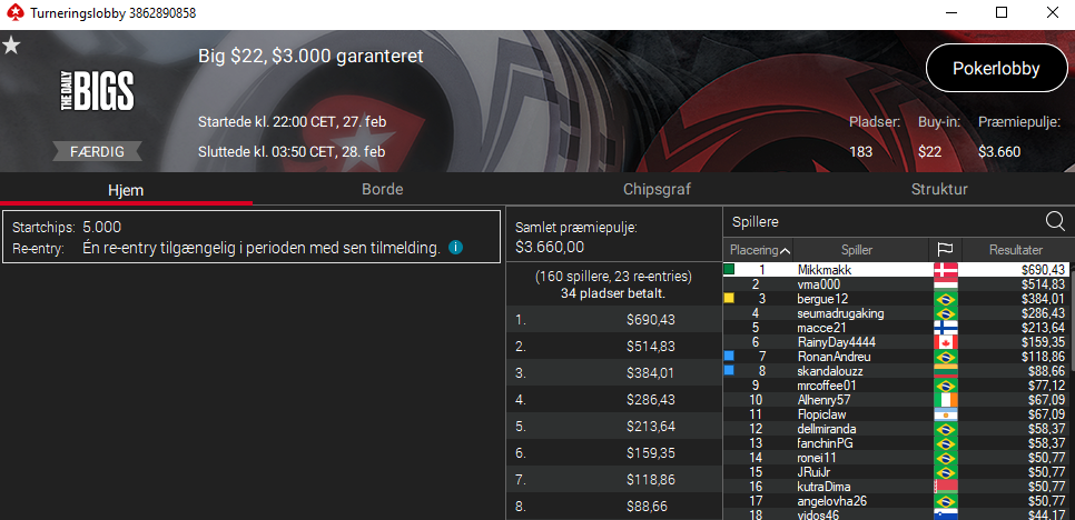 Senere blev en kendt fra Pokernet, Mikkmakk, vinder af Big $22 med $3.000 garanteret. Det blev en sen sejr, da turneringen startede kl. 22.00 men sluttede tæt på kl. 04.00 i nat. Mikkmakk vinder $690 for sejren.
