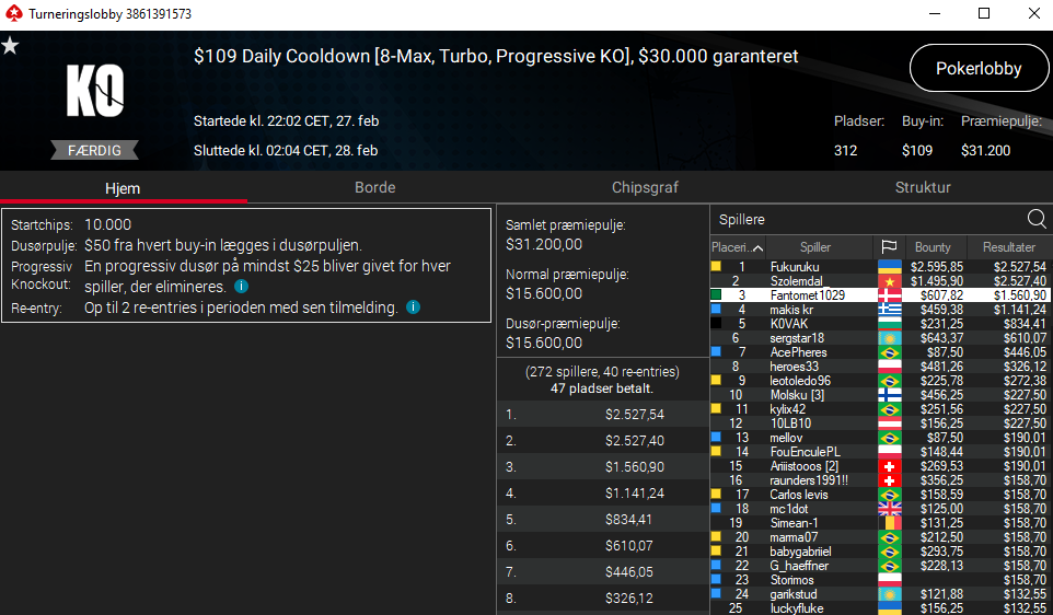 Vi fandt også et par andre topplaceringer. Der var svende21 med en andenplads til $1.736 i $109 Daily Kickoff med $8.000 garanteret. Slutteligt var der Fantomet1029, der var på spil igen, denne gang i $109 Daily Cooldown turbo PKO med $30.000 garanteret. Det blev til en tredjeplads og $2.199.