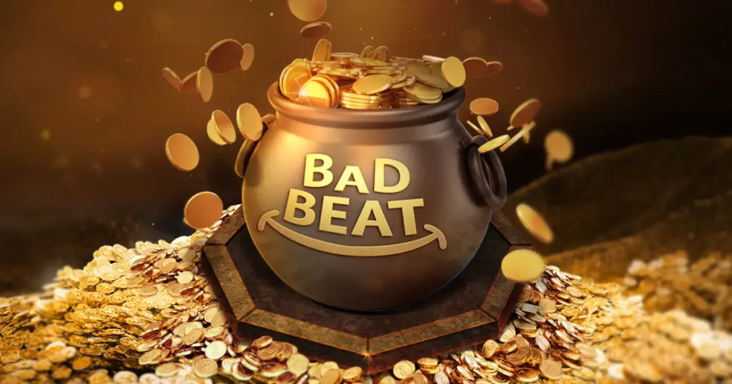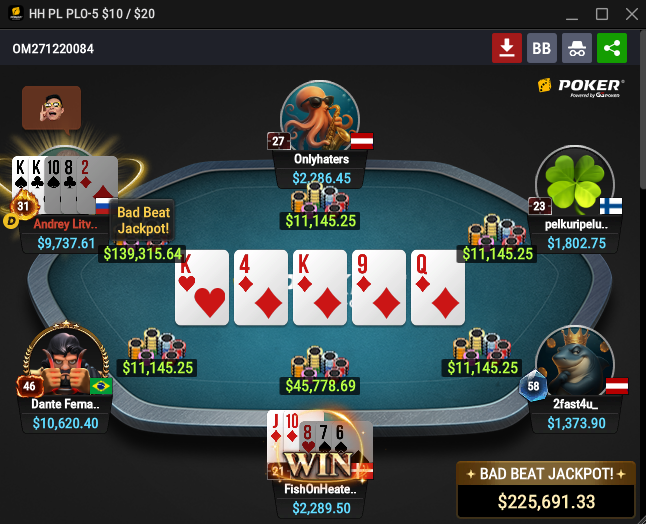 FishOnHeater vinder de $3.984 i potten med sin straight flush. Men så udløser det badbeat den store Bad Beat Jackpot, som på det tidspunkt er på $225.691.