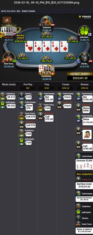 I et 5-kort PLO cashgame spil vandt en dansker i dag en kæmpe badbeat jackpot, selvom spilleren faktisk vandt hånden.