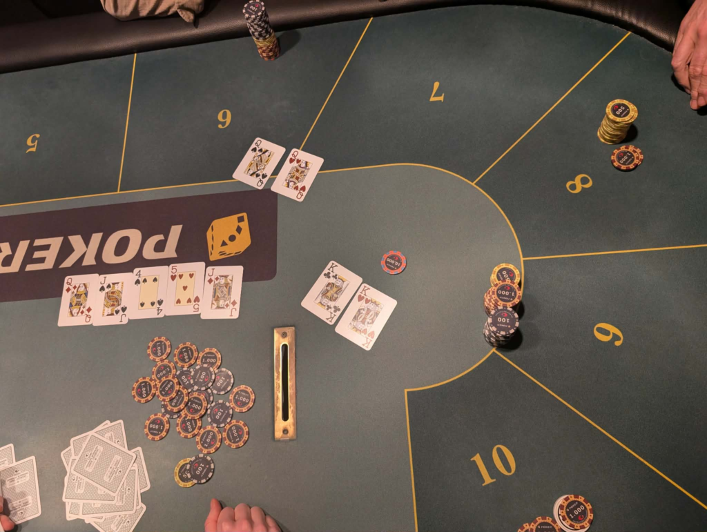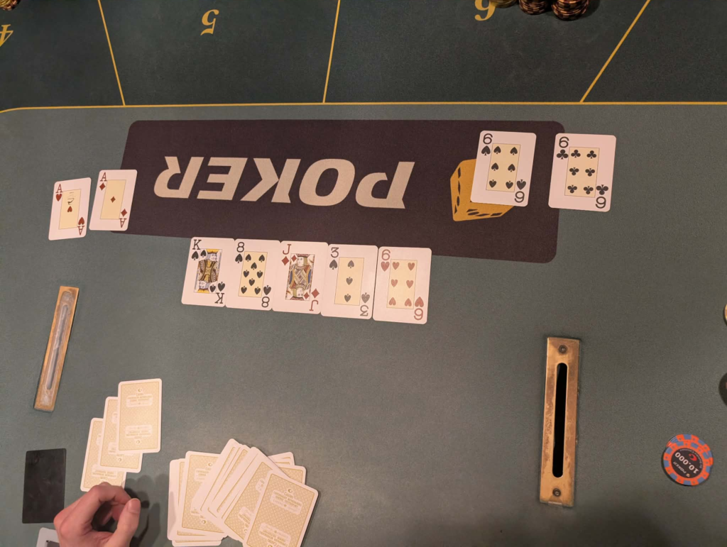 Ole Andersen raiser fra tidlig position. All-in fra Rune Jeppesen med 6erne. Nu vågner Harald Schultz op med esserne og kalder for sit liv, mens Ole folder. Men Rune er heldig at ramme på river: