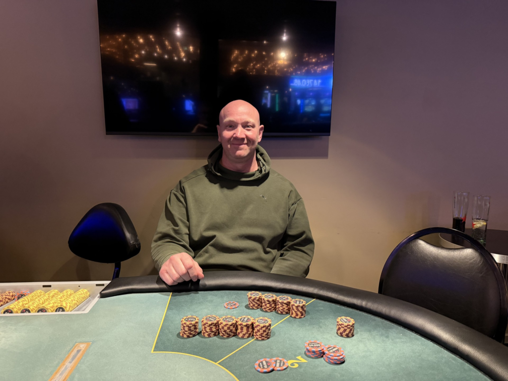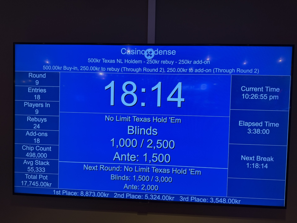 Det var en rolig aften på Casino Odense med 18 spillere fordelt på to borde. Ingen all-in blindt som i tirsdags. Der var de sædvanlige setups og de 18 spillere foretog 24 rebuys og sluttede af med de “obligatoriske” 18 add-ons, hvilket bragte præmiepuljen op på samlet 17.745 kr.