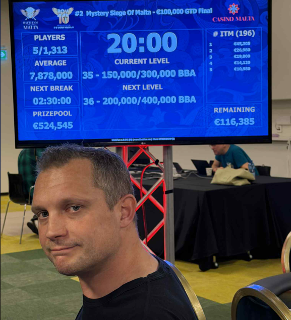 Hans blev som nævnt nr. 3 til DM 2025 til 570.000 kr., nr. 3 hernede i en mindre €330 PLO-turnering til €1.660 og nu nr. 3 efter en ICM-deal i den store €450 Mystery Siege of Malta (Mystery Bounty turnering på Casino Malta).