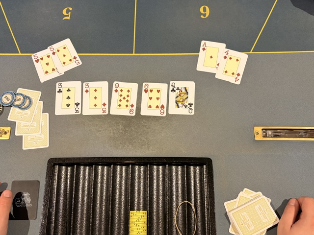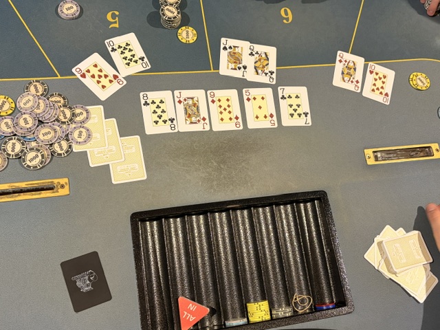 Lidt efter lidt ryger shortstacks ud og inden længe så ender to spillere all-in. Den ene med et flushtræk og den anden med par 5. 5’erne holder hjem og vi er nede på fire spillere.