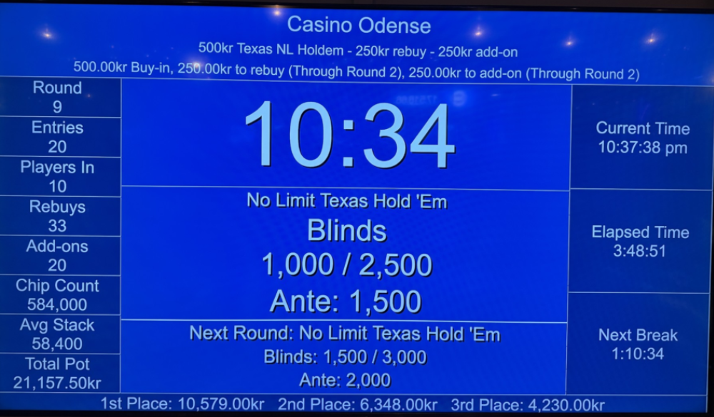 På Casino Odense var torsdagens turnering udsolgt flere timer før de første kort blev delt. De tyve spillere lavede 33 rebuys, og alle afsluttede med et add-on, hvilket sendte den samlede præmiepulje op på 21.157 kr.