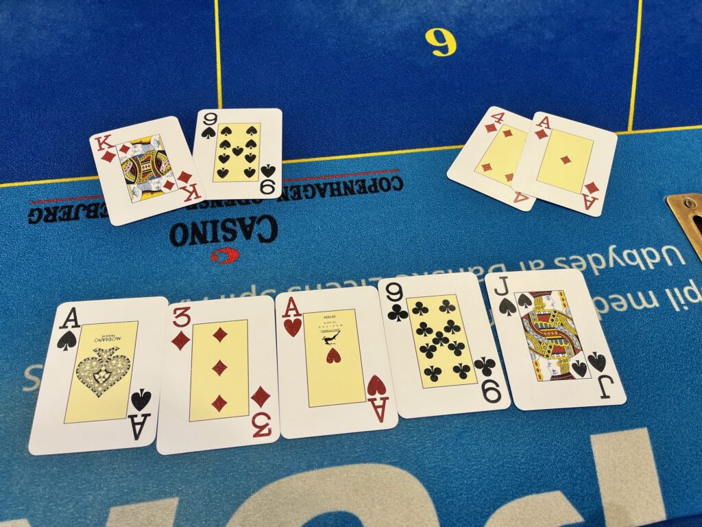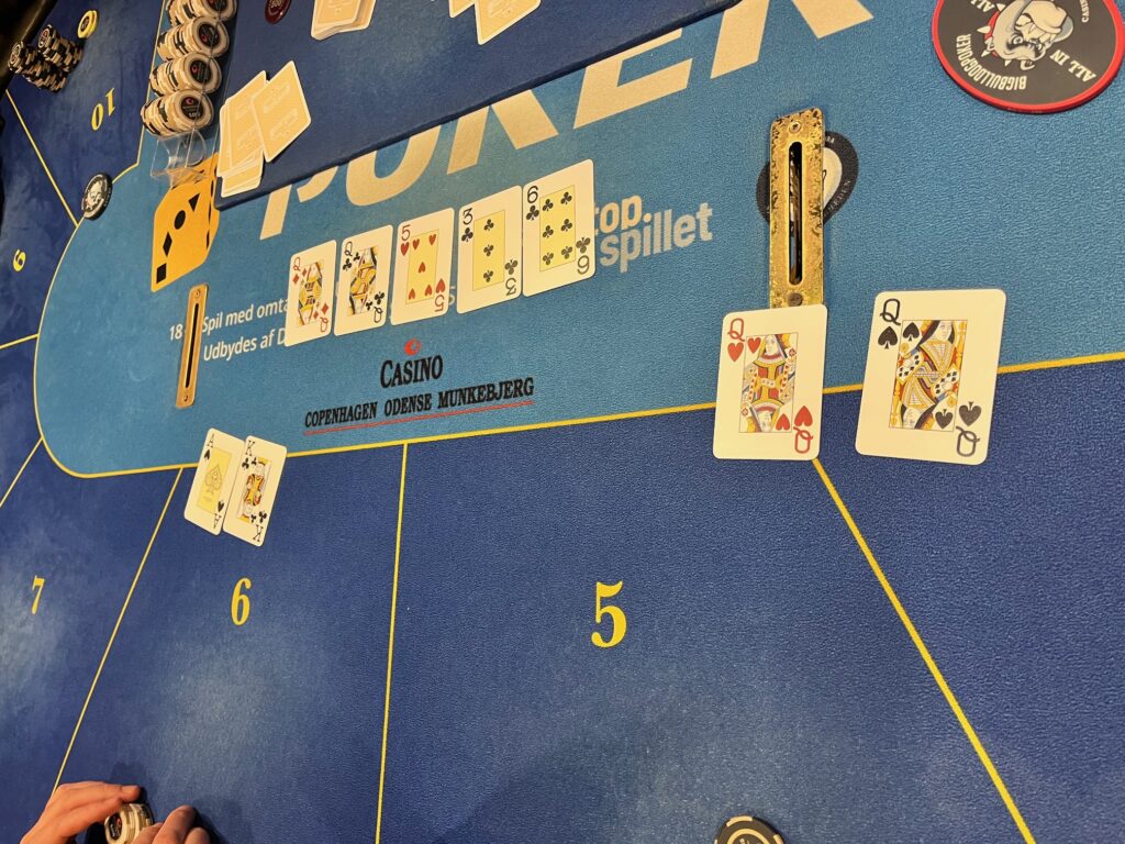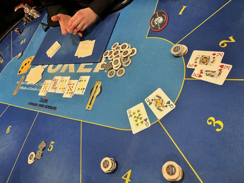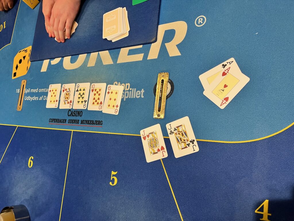 Stadigvæk ingen deal – men tiden for kasinoets lukketid nærmer sig kraftigt. Det lykkedes dog at få afviklet turneringen med syv minutter tilbage. Først ryger Simon Hansen Østergaard (7.800 kr. som nr. 3) i et standard flip med 8ere mod Malina Marcels AJ.