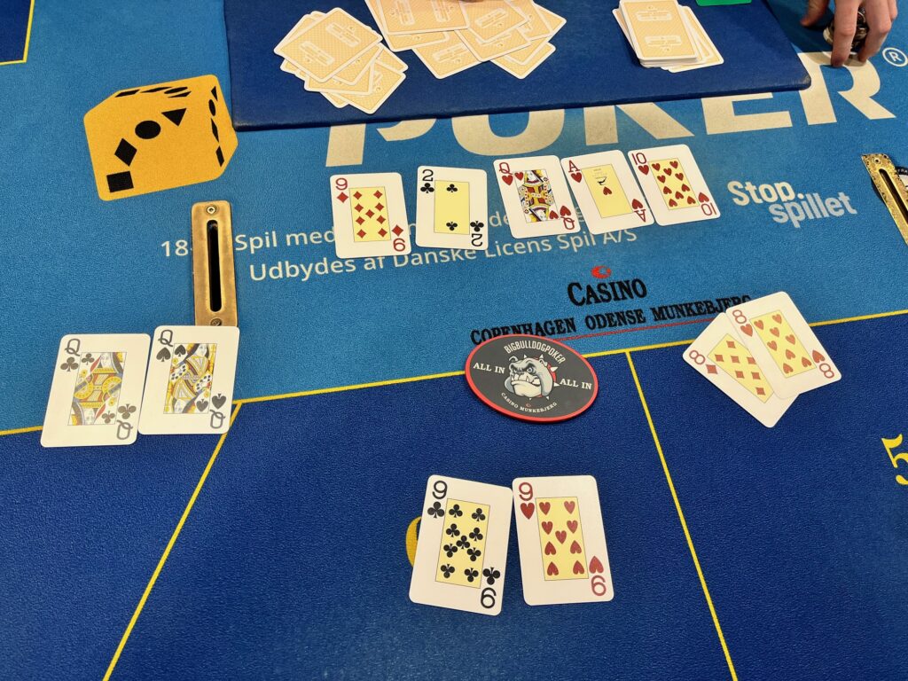 Vi opsnappede én hånd fra den tidlige fase, hvor to spillere ender all-in. Den ene med damer og den anden med big slick (AK). Runner runner quads og tid til et re-entry.