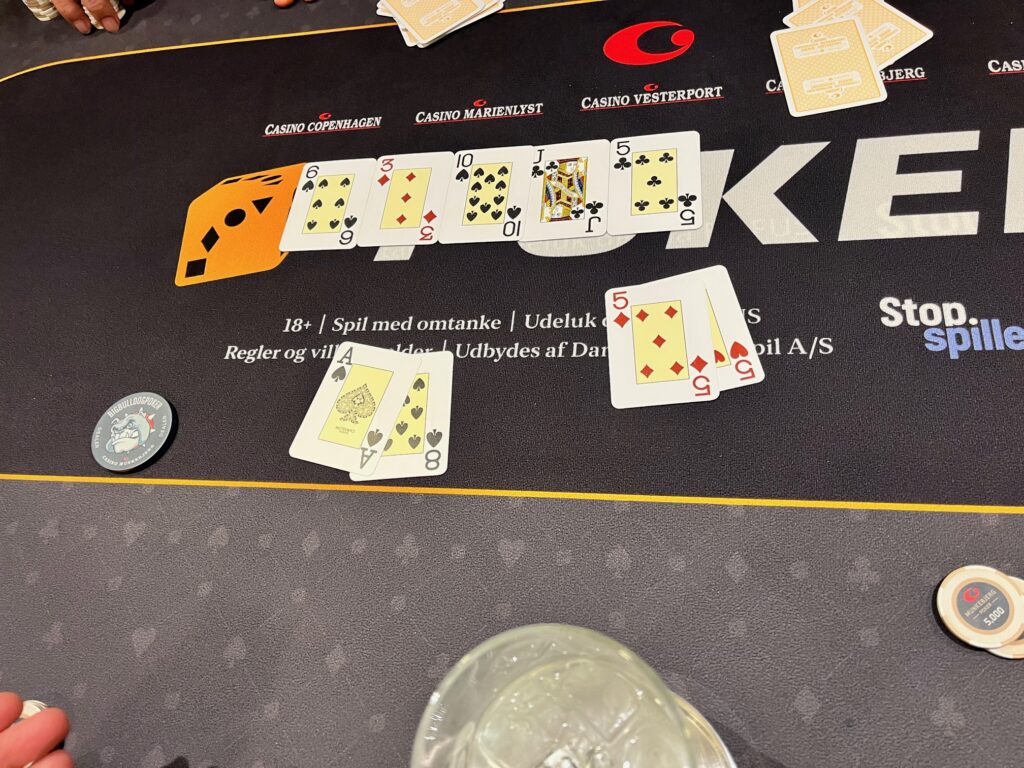 Senere ryger Steen Siebert på noget lignende. Steen er shortstack og må all-in med A8 tæt på boblen. Han bliver kaldt af Frederik Johansen, der har 55. Et set på floppet til Frederik og Steen siger pænt tak for i dag.
