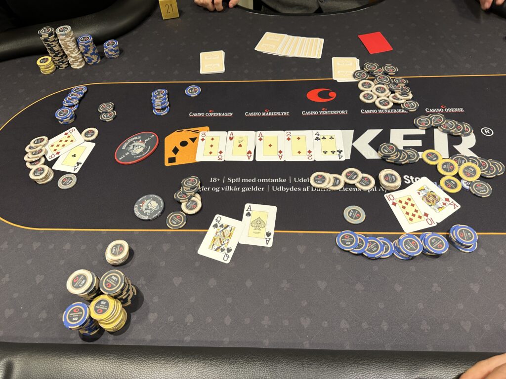 Den næste er en 3-vejs all-in senere i spillet, hvor Rasmus Lundholm laver en river flush mod Simon og Kasper. Her er vi lidt i tvivl om, hvornår chipsene kommer ind, men gætter på river.