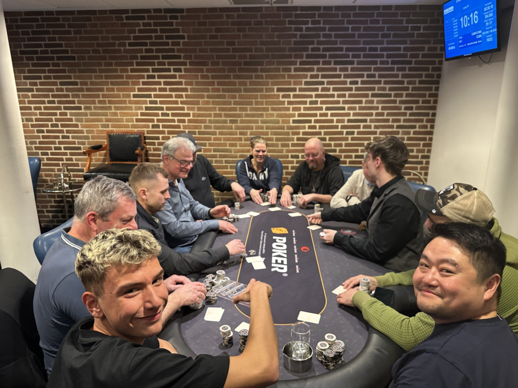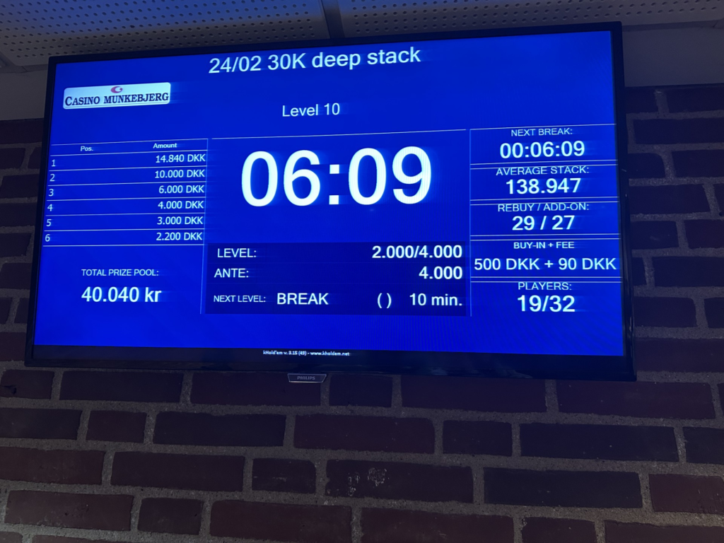 På Casino Munkebjerg i pokerkælderen var der igen tirsdagsturnering i går tirsdag den 24. februar 2026. Der var 32 spillere til start, som foretog i alt 29 re-entries og 27 add-ons. Det bragte præmiepuljen lige over de 40.000 kr. med totalt 40.040 kr.