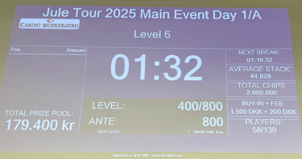På Casino Munkebjerg blev der i går spillet dag 1A af årets sidste pokerturneringsserie: Jule Tour 2025. Det hele endte med 130 entries og en chipleader, Ahmad Mousa, med 546.000 i posen.