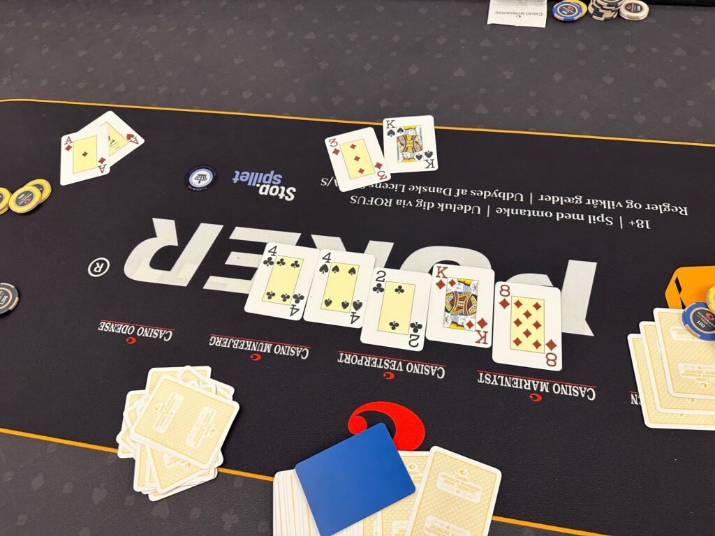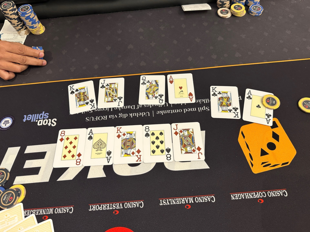 I en multiway pot landede der tre ottere på floppet, og fem spillere endte i showdown, hvor esserne igen holdt hjem. Denne gang var det Andrej Juzlo, som kunne skrabe potten ind med det bedste af fire fulde huse, mens en chanceløs flush blev nummer fem i hånden.