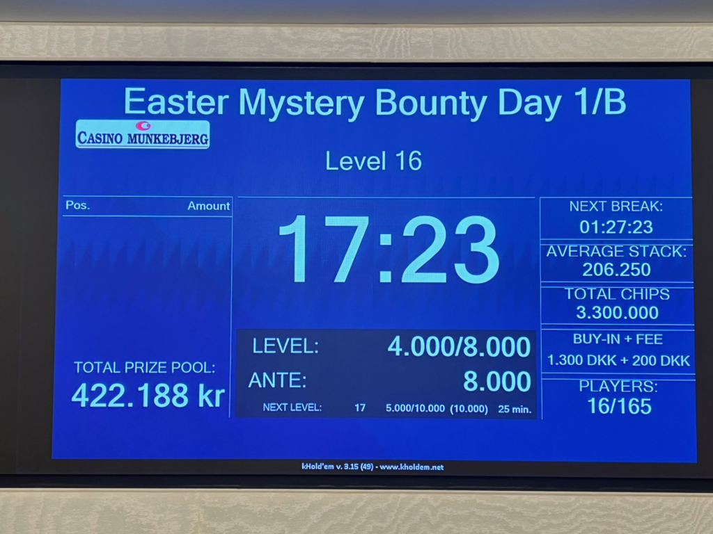 Det betyder, at der er en foreløbig præmiepulje på 422.188 kr. efter dag 1B, og med yderligere fire flights i vente er det kun et spørgsmål om, hvor meget over millionen den samlede præmiesum ender. Præmiepuljen fordeles mellem præmier og de eftertragtede Mystery Bounties.