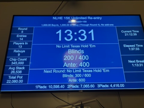 Onsdag den 4. marts 2026 var der 14 spillere klar til kamp. Der blev foretaget ni re-entries, hvilket bragte det samlet entries op på 23 i alt. Skulle man tage 10% af det, er det blot top-2. Kasinoet valgte dog at tre spillere fik penge, hvilket er fair. Præmiepuljen var på 22.080 kr.
