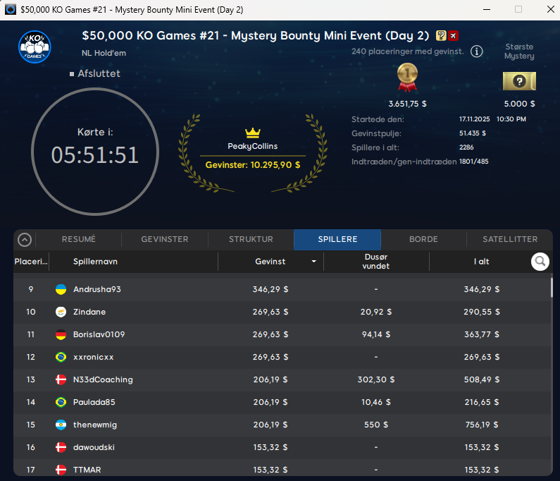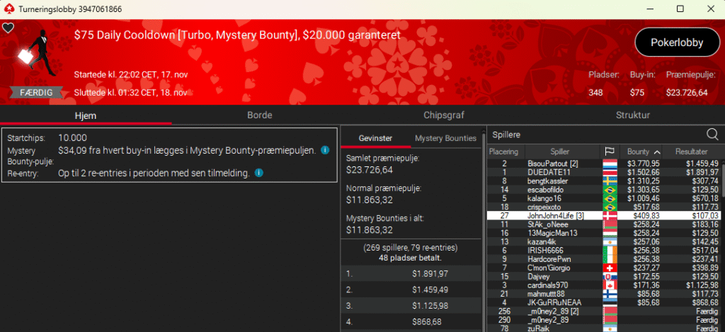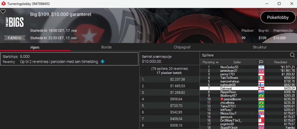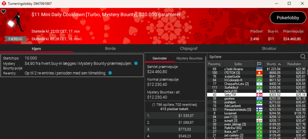 I den “billige” version af denne turnering; $25 Mini Mystery Bounty Main Event med $50.000 garanteret var det N33dCoaching, der er tilbage online, og blev bedste dansker som nr. 13 til samlet $508.