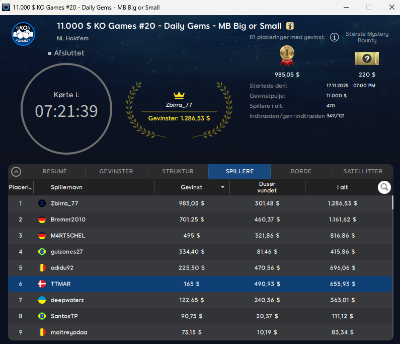 I $22 Daily Gems MB Big or Small KO med $11.000 garanteret blev TTMAR bedste dansker som nr. 6 og vandt $656.