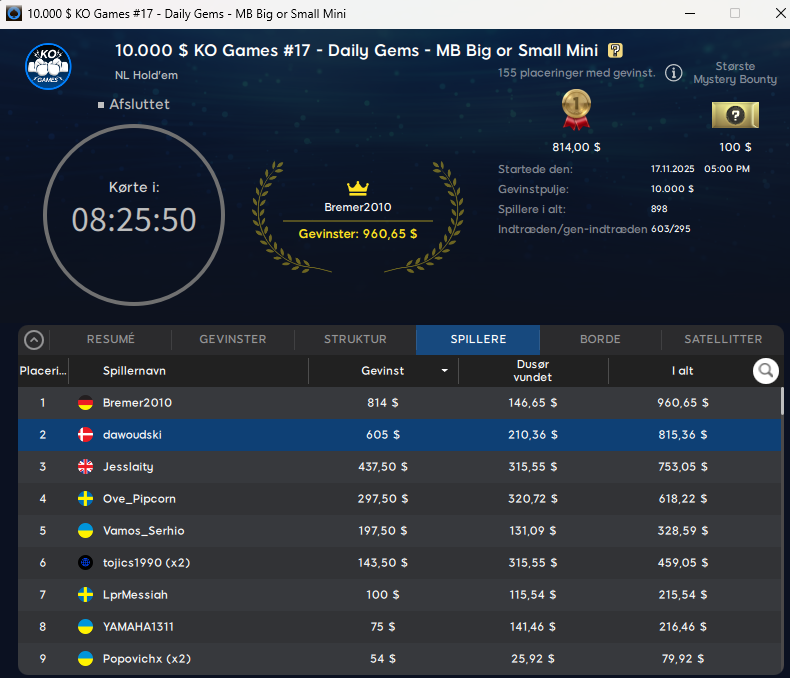 Til den halve pris $11 blev der spillet samme turnering: Daily Gems MB Big or Small Mini med $10.000 garanteret. Her blev dawoudski nr. 2 til samlet $815.