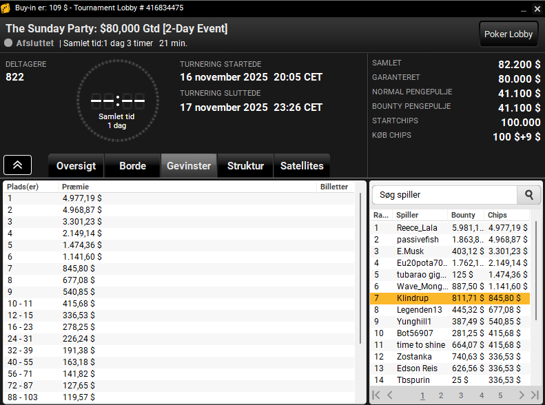 På Danske Spil Poker var der stadigvæk lidt “Party magi” og selvom vi ikke kan se danske flag, så fandt vi et “nick”, som vi kender. Derfor kan vi fortælle, at Brian “Klindrup” Klindrup blev nr. 7 i søndagsflagskibet $109 The Sunday Party med $80.000 garanteret. På dag 2 endte Klindrup med at vinde samlet $1.658.