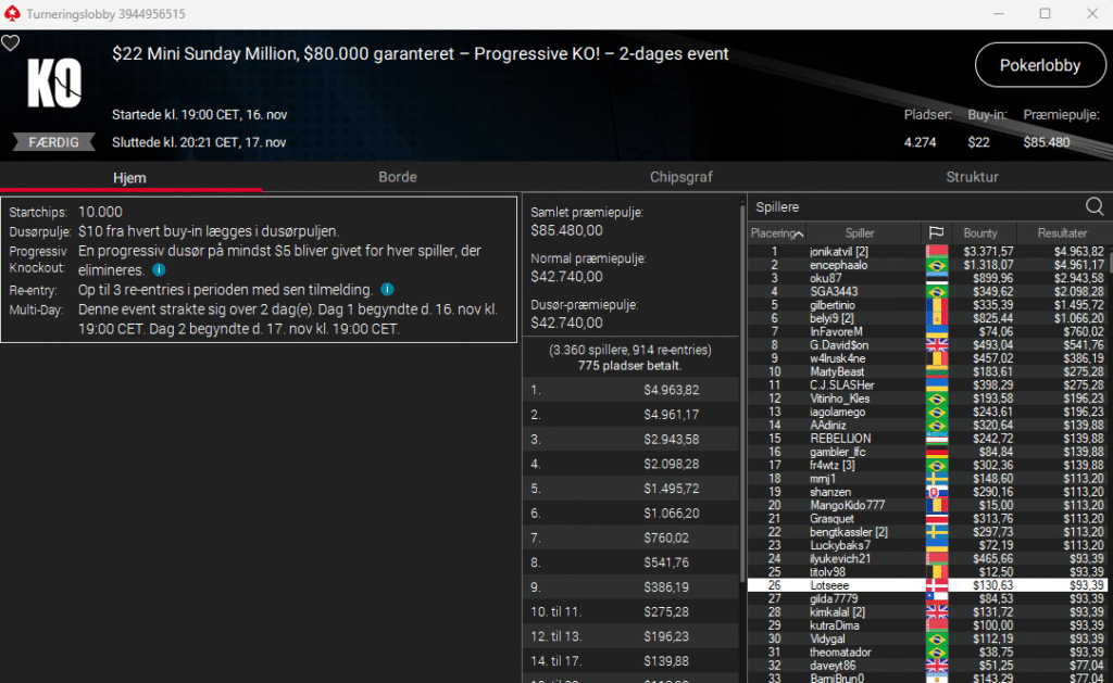 I $22 Mini Sunday Million med $80.000 garanteret blev Lotseee nr. 26 ud af 4.274 og vandt $224.