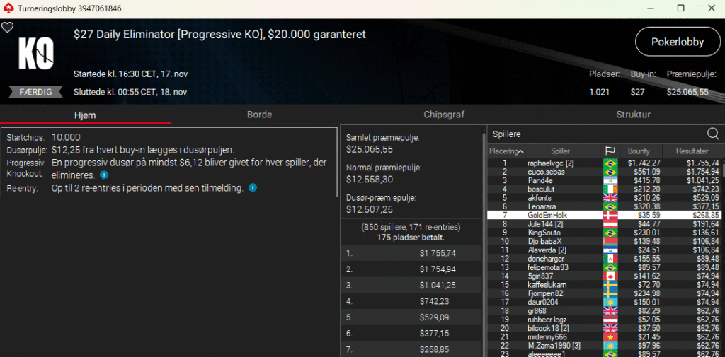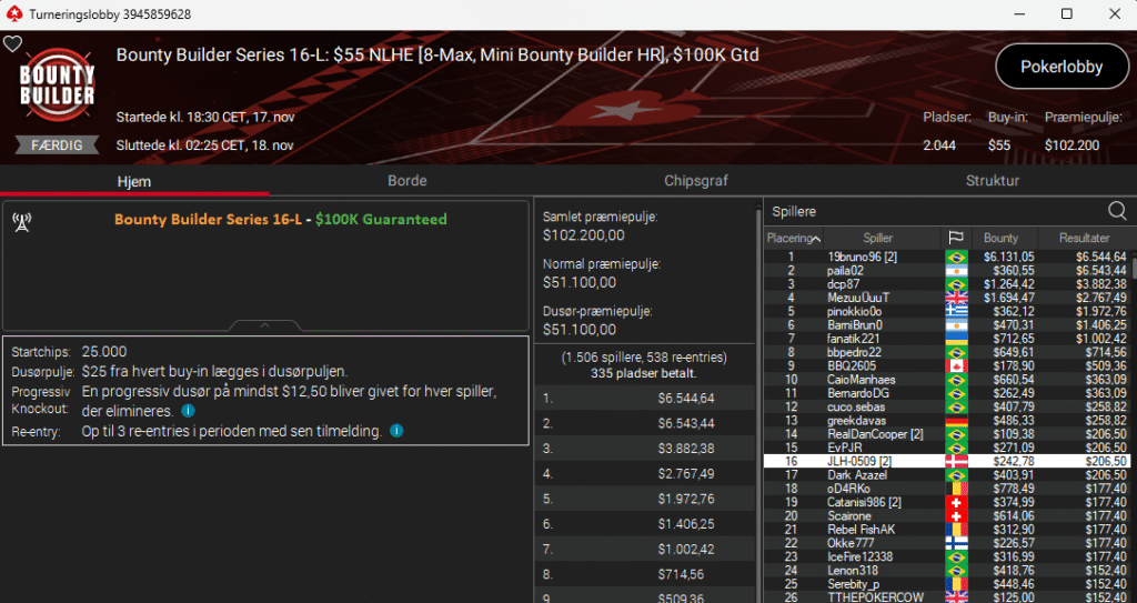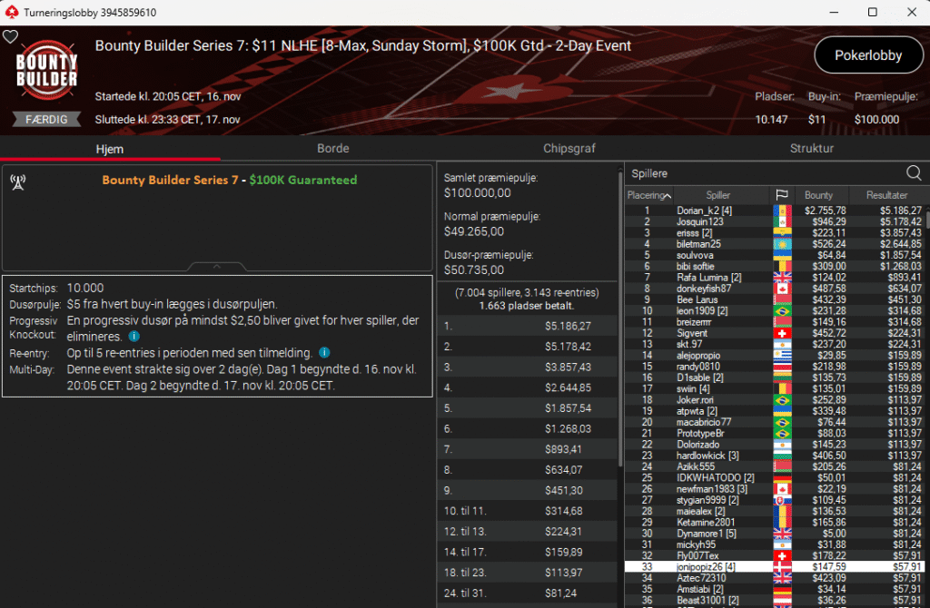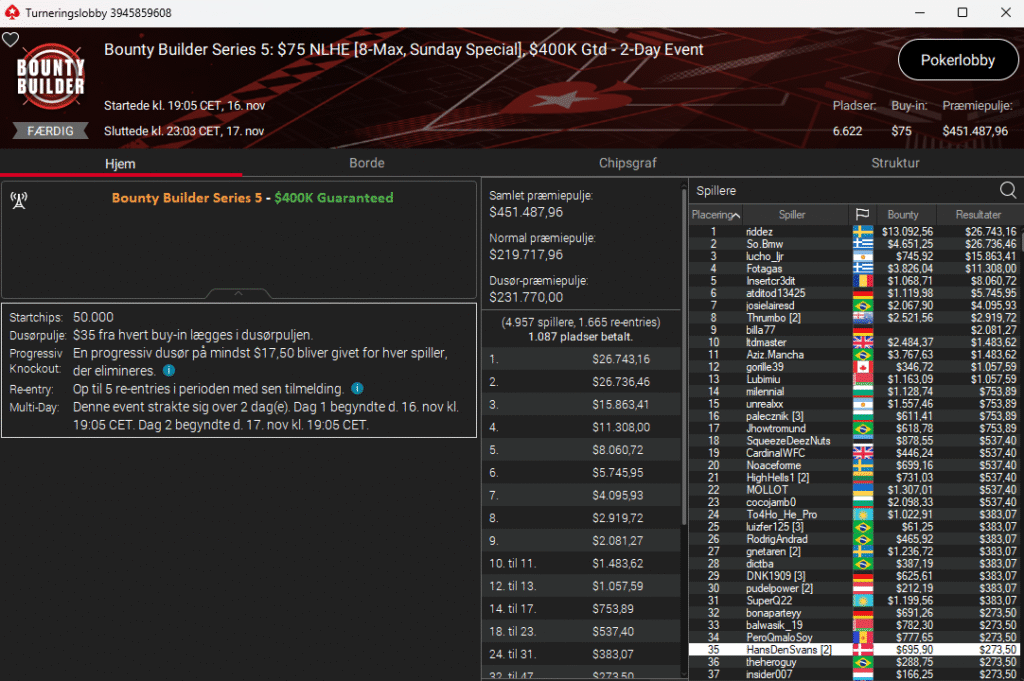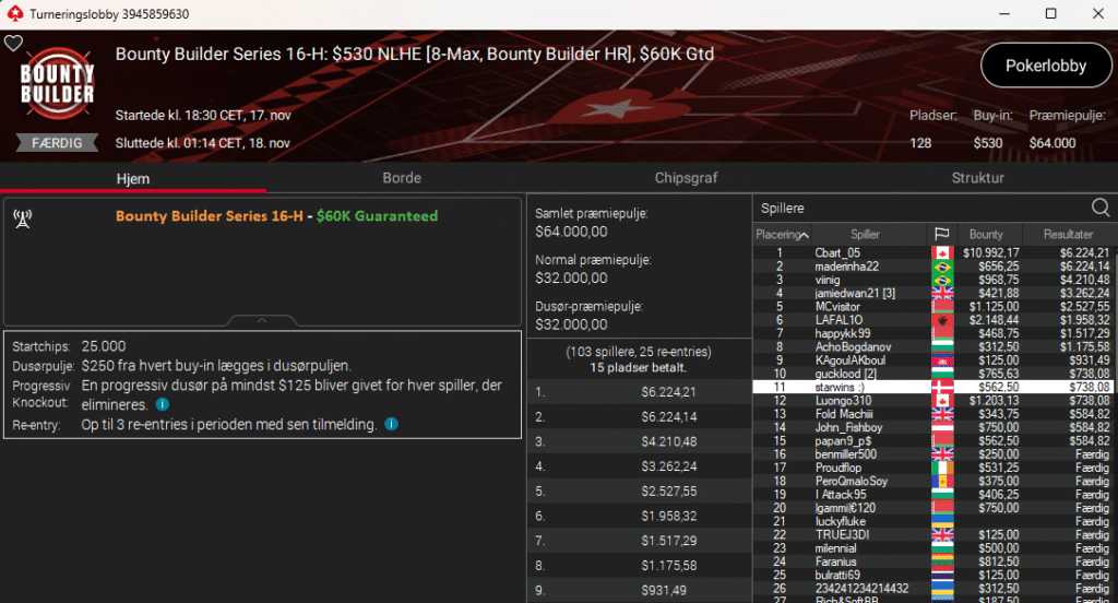 Daniel “Starwins” Petersen bliver nr. 11 til samlet $1.301 i $530 Bounty Builder Series NLH med $60.000 garanteret.