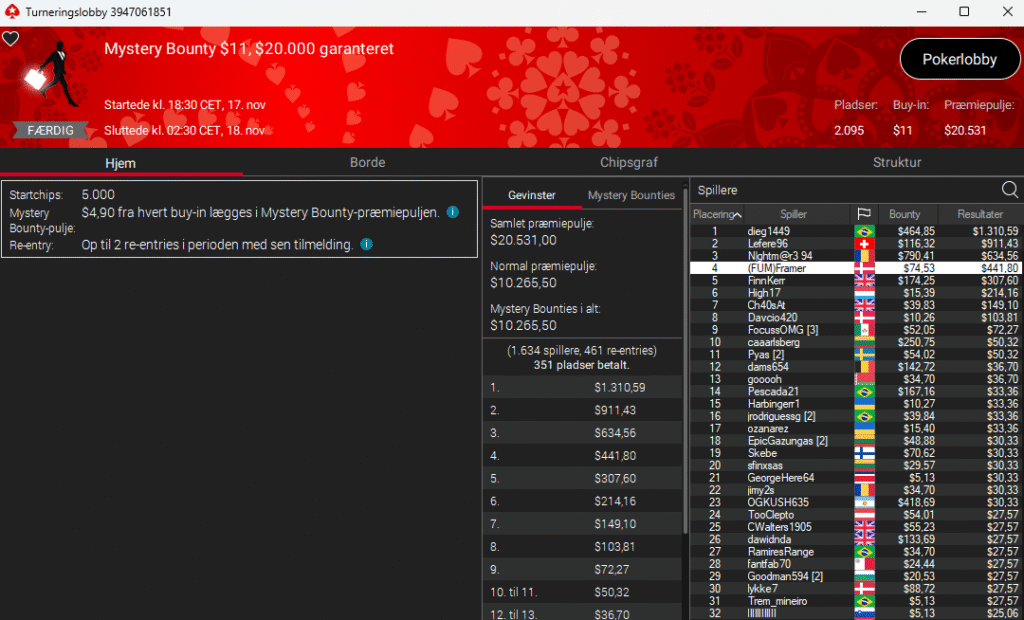 (FUM)Framer blev nr. 4 i $11 Mystery Bounty med $20.000 garanteret til samlet $517.