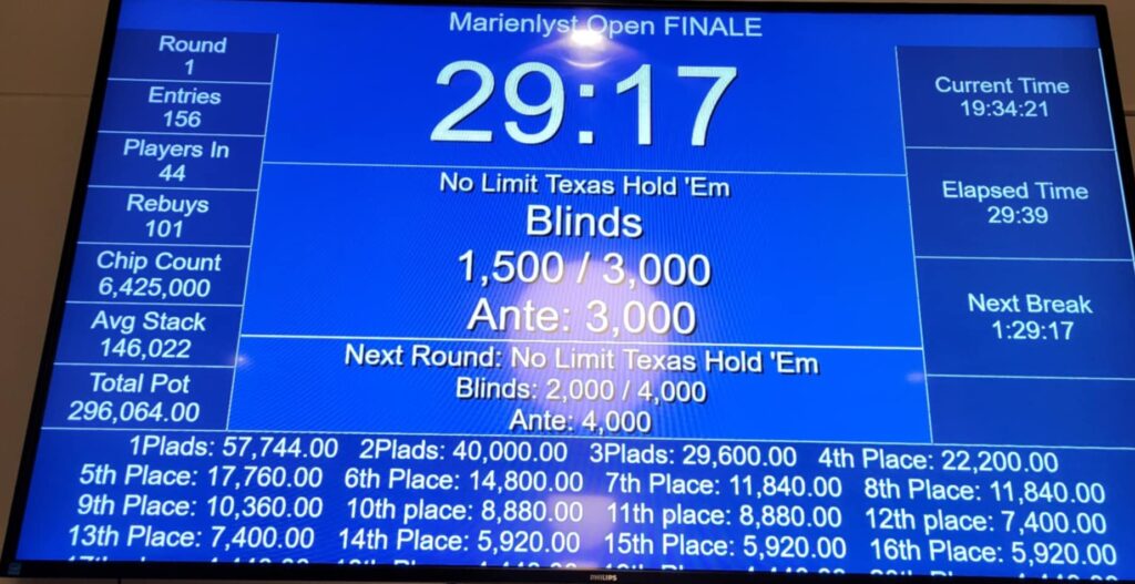 Efter boblen var sprunget kort før kl. 21.30, var de sidste 24 spillere sikret 2.960 kr. Herefter kunne spillerne tage lidt større chancer, hvor enten en dobling ventede, eller turen gik hjem.