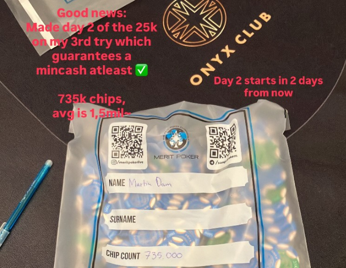 Det er dog ikke så skidt, at Martin Dam alligevel har fået ramt plet på sit tredje skud i $25.000 Main Event. Her har han bygget en top-10 stack og sidder altså over i dag inden dag 2 spilles i morgen onsdag. Spillerne er i pengene når de rammer dag 2.
