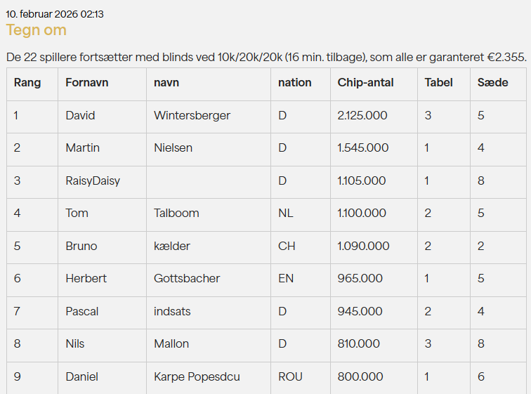 Den danske pro ligger 2er i chips på finaledagen, der spilles i dag tirsdag den 10. februar 2026.