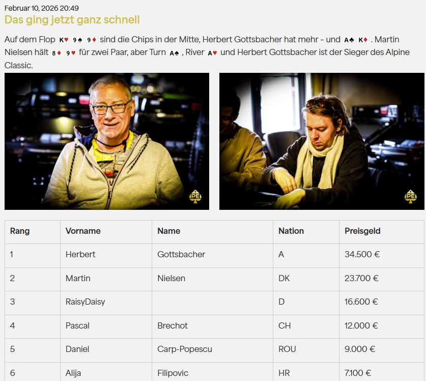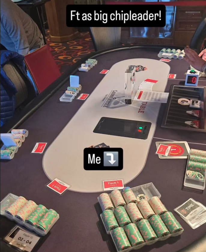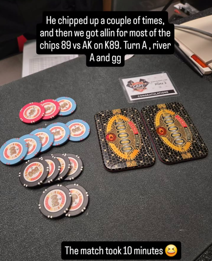 Alt havde sådan set spillet perfekt frem mod heads-up dysten mod den lokale Herbert Gottsbacher. Men så vendte Fru Fortuna sit grime ansigt og indenfor kort tid havde han tabt det store chiplead og fik endda en gigantisk badbeat på vej ud af turneringen – se bare nedenfor – selv ikke tysklæsende kan nok godt forstå: