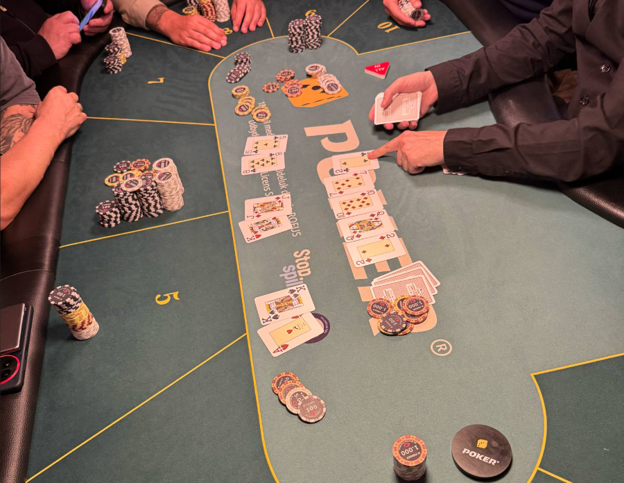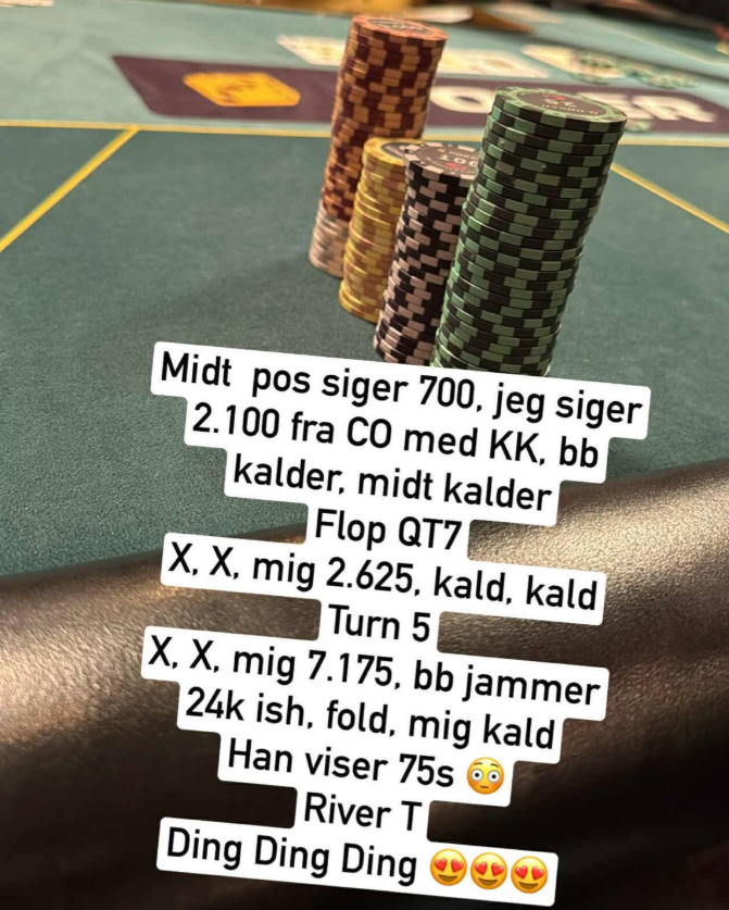 Dansk Poker fangede også lige hurtigt Danmarksmesteren fra 2022, Thomas Hølmer, der også er videre med en fin stack (271.200). Dansk Poker spurgte drilsk om han var heldig igen – han svarede “Haha, jeg fik et fint setup i slutningen af dagen i en 170.000 pot, hvor jeg har top to-par med KQ mod top par med es kicker (AK) og får heldigvis sizet mine bets rigtigt, så han føler sig committed på river”.