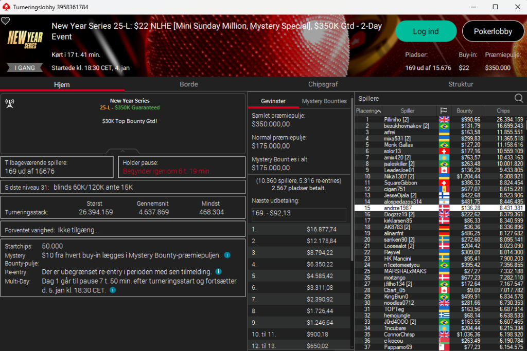 Der var sørme også overlay i New Year Series: $22 NLH Mini Sunday Million – Mystery Special med $350.000 garanteret. 15.676 entries til start og der resterer 169 spillere (sikret $92).