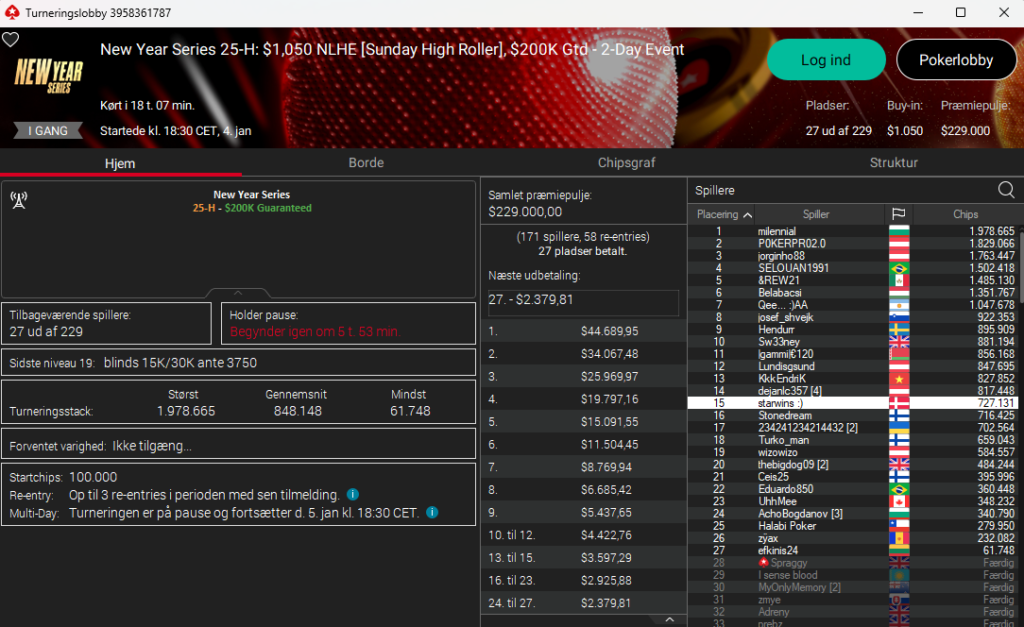 I highroller versionen, New Year Series: $1.050 NLH Sunday Highroller med $200.000 garanteret, er Daniel “starwins” Petersen videre til finaledagen midt i feltet som nr. 15 ud af 27. Alle er sikret $2.380 – men de fleste har nok øjnene på de $44.690 i førstepræmie.