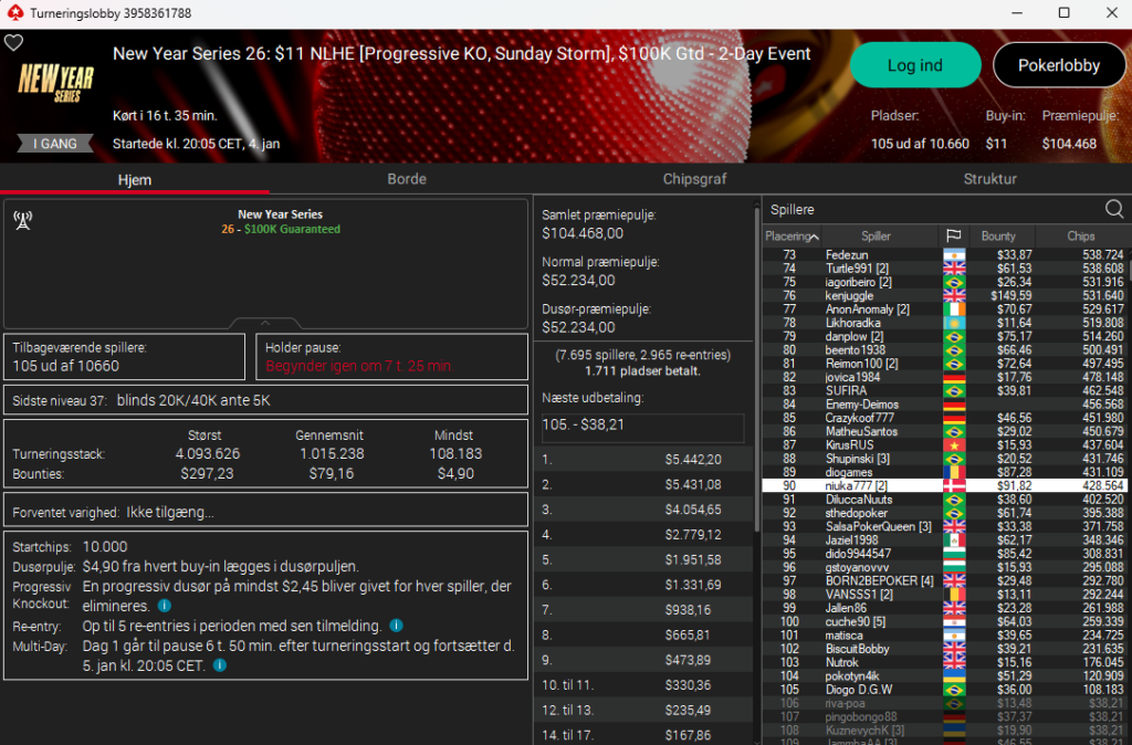 Der er også en dansker videre i New Year Series: $11 NLH PKO Sunday Storm med $100.000 garanteret. Det er niuka777 – men danskeren liger i den tunge ende af feltet som nr. 90 ud af 105 (sikret $38). Der var 10.660 entries totalt.
