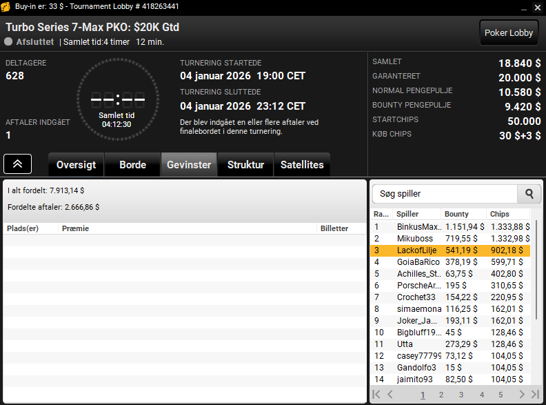Først var det Nikolaj “LackofLilje” Liljengren, der blev nr. 3 i $33 Turbo Series 7-Max PKO med $20.000 garanteret. Samlet ender præmien på $1.443.