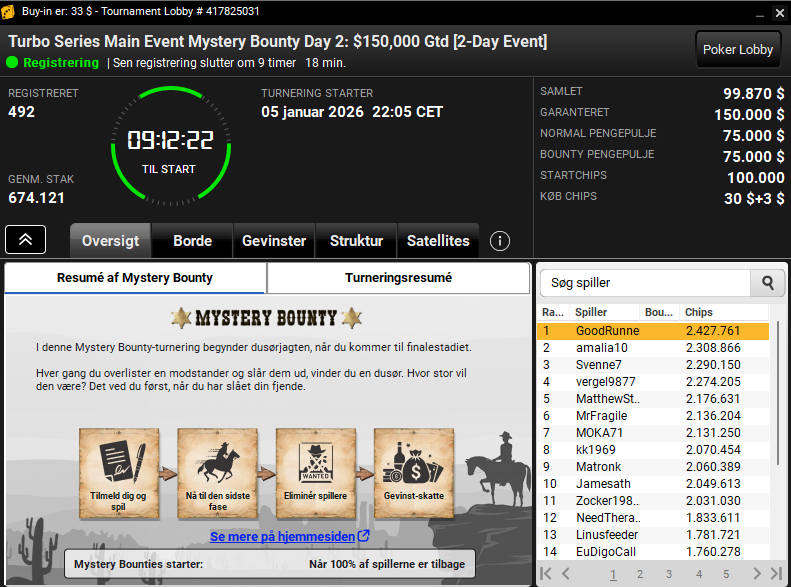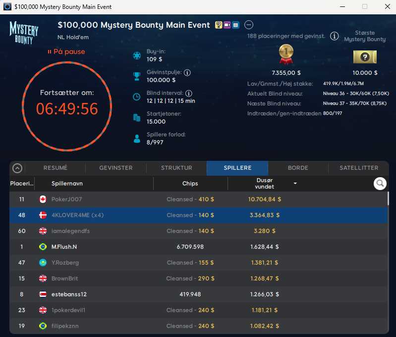 I mini-udgaven af Sunday Million har vi hele fire danskere i top-26 og totalt ni danskere i alt. Den største Mystery Bounty var på hele $30.000, hvilket er lidt vildt, da førstepræmien “blot” er på $16.878. Alle store bounties er desværre allerede væk.