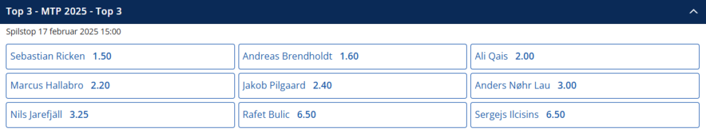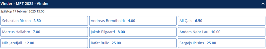 Tror du på Sebastian Ricken som mester, så kan du få odds 3,5. Eller hvad med dygtige Rafet Bulic? Får han fat, så bliver han farlig. Odds 25 er nok det bedste odds for en spiller hans kaliber.