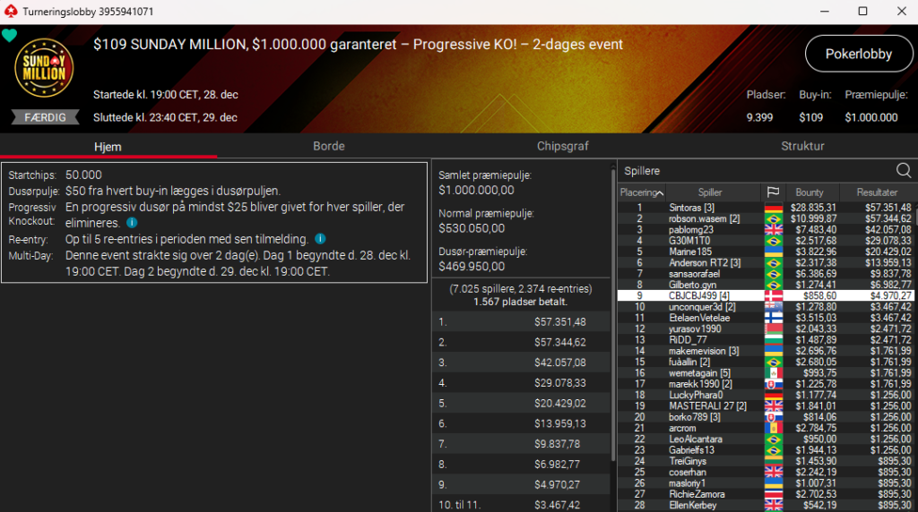 Det blev nemlig til et finalebord for danskeren med det specielle nick: CBJCBJ499. Dog slutter det desværre allerede på en 9. plads til samlet $5.829. Men et Sunday Million finalebord på resuméet er ikke så ringe en trøst.