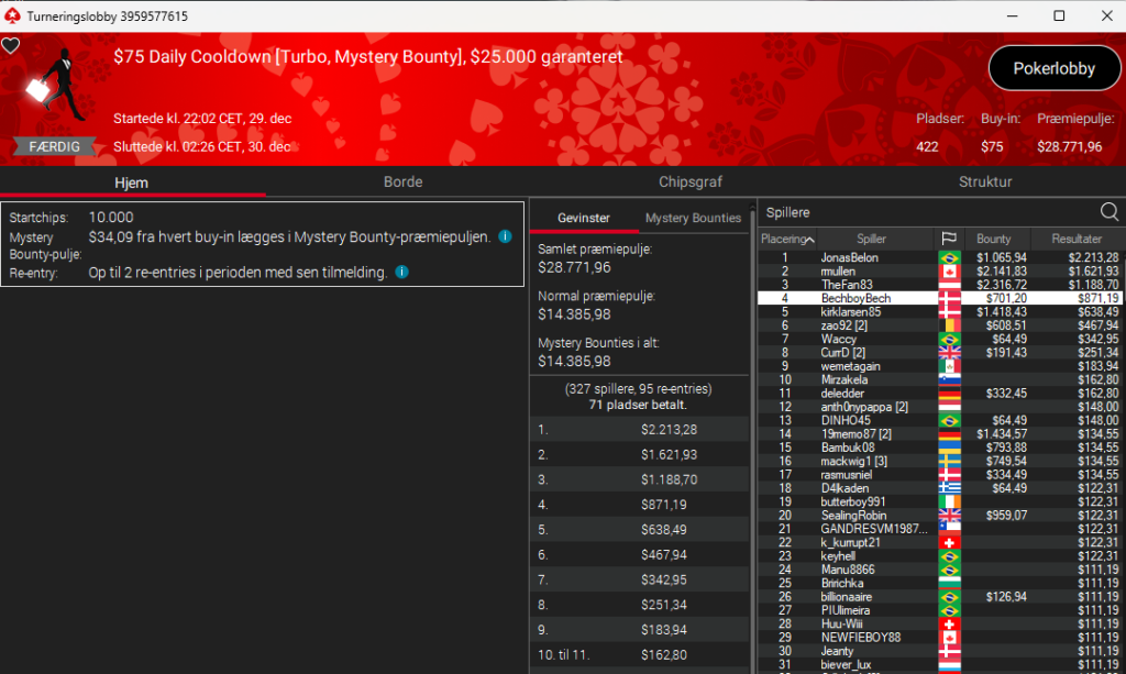 Eneste andet nævneværdige resultat vi fandt fra mandagens turneringer på PokerStars var BechboyBech og kirklarsen85, der blev henholdsvis nr. 4 og nr. 5 på finalebordet i $75 Daily Cooldown Turbo Mystery Bounty med $25.000 garanteret. BechboyBech vandt totalt $1.572, mens kirklarsen85 vandt lidt mere $2.057.