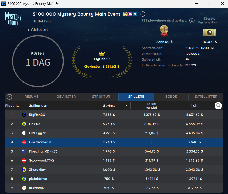 I søndagsflagskibet $109 Mystery Bounty Main Event med $100.000 garanteret blev Gostfromeast nr. 4 til $2.940 (ingen bounties overhovedet – hvilket i sig selv er vildt nok), mens SqxxwrechTHQ blev nr. 6 til samlet $1.647.
