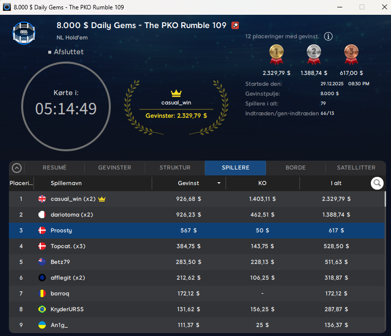 Vi fandt også denne lobby med Proosty, der vinder $617 som nr. 3 og Topcat., der vinder $529 som nr. 4 i $109 Daily Gems The PKO Rumble med $8.000 garanteret.