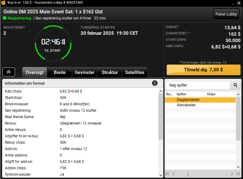 Artikelfoto: Lobby til $7,50 satellitten på Danske Spil Poker til Main Eventen med start hver dag kl. 19.30