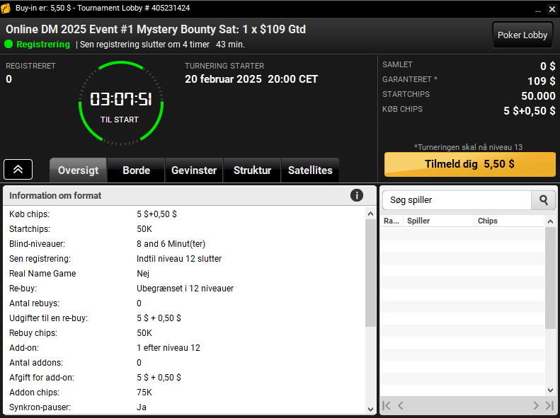 Artikelfoto: Lobby til $5,50 satellitten på Danske Spil Poker til Event #1 Mystery Bounty med start hver dag kl. 20.00