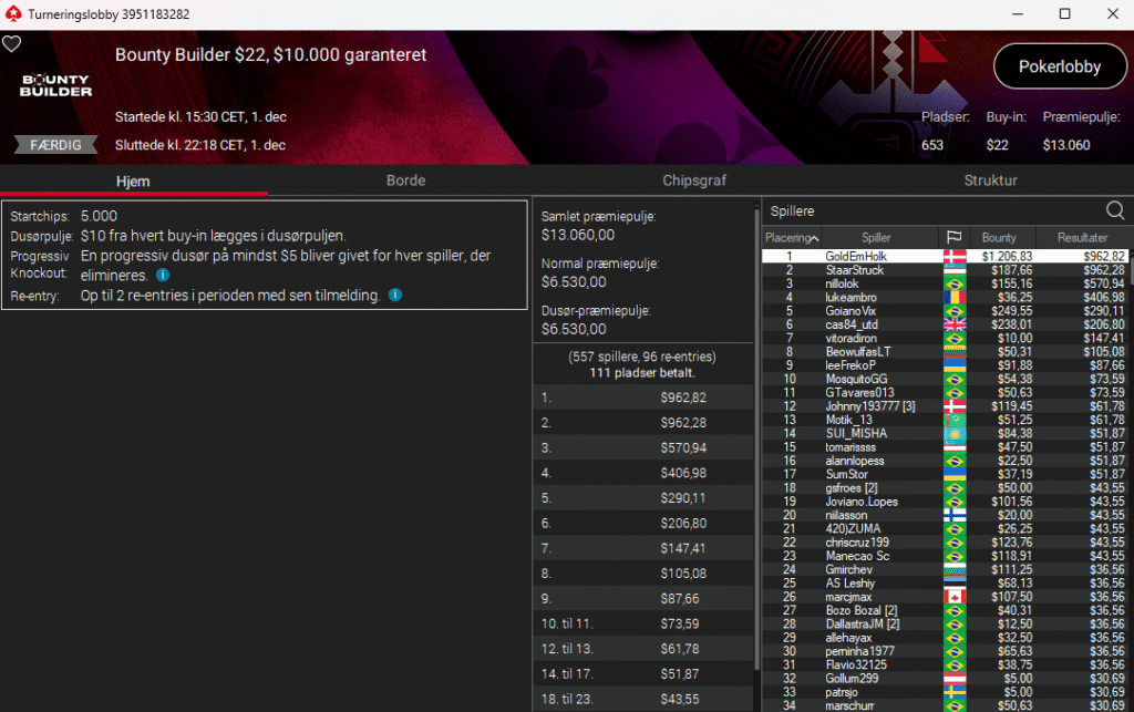 Det blev også til en sejr til GoldEMHolk, der satte alle brasilianerne på plads i $22 Bounty Builder med $10.000 garanteret. Danskeren vinder samlet $2.172.